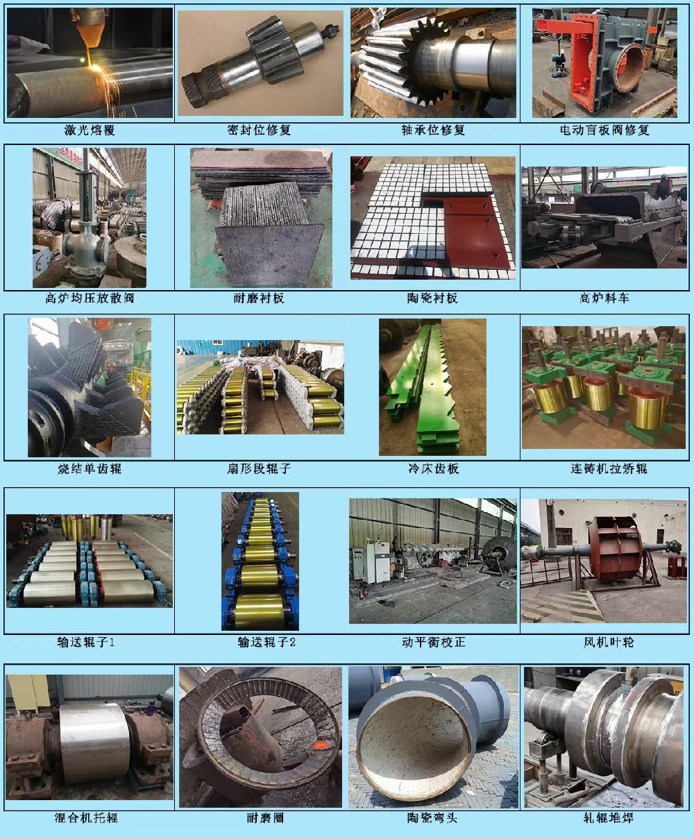 公司致力于硬質耐磨材料的技術開發及應用、激光熔覆修復、中速磨磨輥、單齒輥破碎機轉子、篦板、四輥輥子、連鑄輥和耐磨輸送輥的加工和修復,軋輥修復、各類閥門修復、旋轉設備平衡實驗、耐磨合金板及陶瓷襯板等的制作與安裝、機械設備檢修服務。